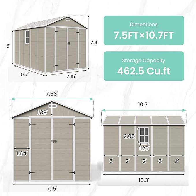 - SPACIOUS 7.5ftx10.7ft STORAGE SHED: Roof: 128.35 inch(L)x90.35 inch (W); Base: 123.6 inch (L)x 85.8 inch (W); Hight 88.98 inch (H). UDPATIO resin shed offers a generous amount of storage room for various items such as gardening tools, outdoor sports gear, and seasonal items. It serves as a valuable extension to your yard, whether storing tools or providing a cozy home for your pet, or use as a bin storage room, it can satisfy your various requirements