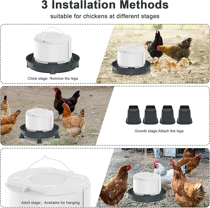 - 【Multiple Installation Options】Our heated poultry drinkers come with stainless steel hooks and four detachable legs, suitable for poultry of all ages. You can choose to hang it in the chicken coop for adult chickens, or install or remove the legs for chicks. Easy installation anytime, anywhere. Suitable for any chicken coop/cage, making feeding more convenient. Our water container uses gravity to provide a constant water flow; simply rotate and remove the water tank base to easily add water.