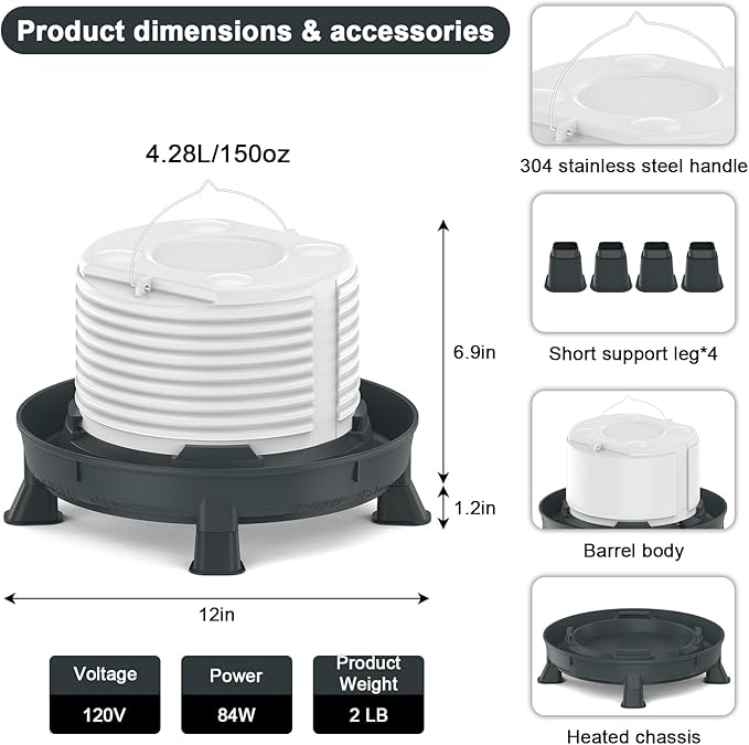 - 【After-Sales Guarantee】Our chicken heated waterer has a 12-inch diameter chassis and an 8.1-inch height (including support feet), with a 78.7-inch (approximately 200 cm) power cord. The product is durable and comes with a one-year limited warranty. If the waterer fails to heat properly, please stop using it and contact us. We will respond within 24 hours and provide the best solution.