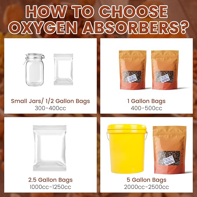 - 【500cc High Oxygen Capacity】 Each absorber removes up to 500cc of oxygen, ideal for 1-gallon Mylar bags, pantry containers and airtight food storage for staples like grains, beans, flour, pasta, cereal, powders, and preserved foods.
