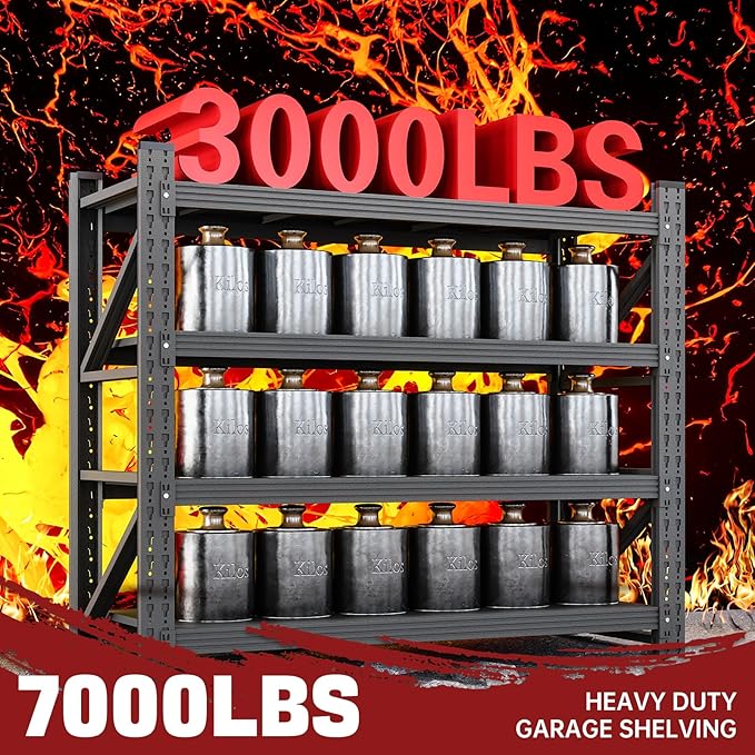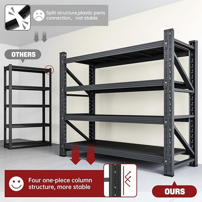 - 【HEAVY DUTY FOR REAL】Our super heavy-duty garage shelving featuring one-piece columns that are seamlessly constructed without any joints. This design eliminates weak points and ensures maximum stability, even under the heaviest loads. Each column is wider and thicker than standard models, providing a solid foundation that can handle up to 3000 lbs in total weight. Whether you’re storing heavy machinery, large containers, you can trust our garage shelving to keep your items safe and secure.