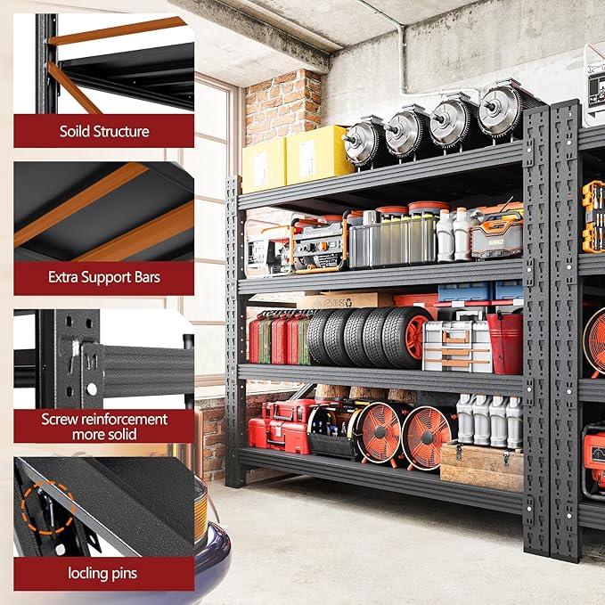 - 【ADJUSTABLE SHELVES & LOCKING PINS】Our Super Heavy-Duty Garage Shelving Unit features adjustable shelves that can be easily moved to accommodate items of different sizes. The locking pins also add an extra layer of security, preventing accidental disassembly and ensuring that your items remain safely stored. This user-friendly design makes our heavy-duty shelving unit a practical and convenient solution for a wide range of storage applications