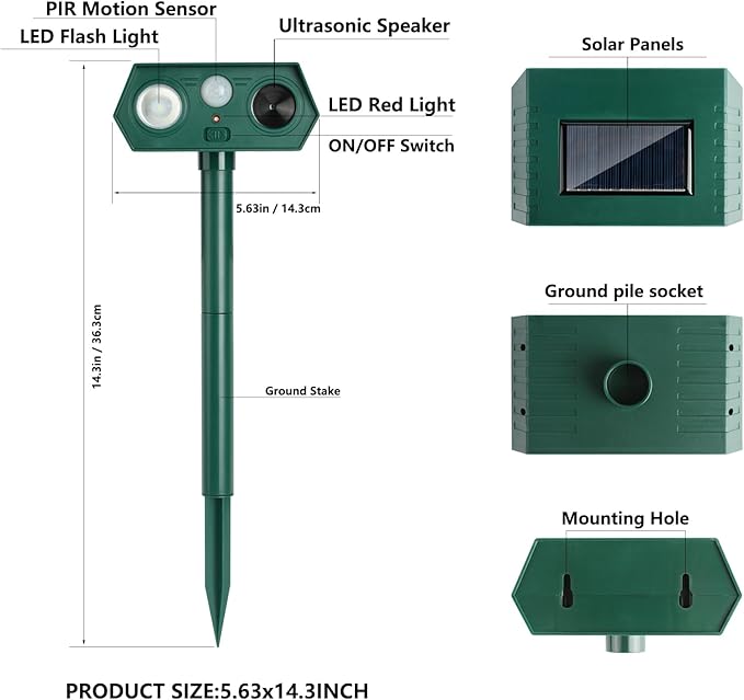 - 【Safe & Human Design】You can simply insert the animal repeller into the ground or hang up where there is plenty of sun light and switch it on, which is perfect for yard, patio, garage, attics, porches, boats, garden, farm, pond, etc. Besides, it is mini enough for you to take it to outdoor, such as camping.