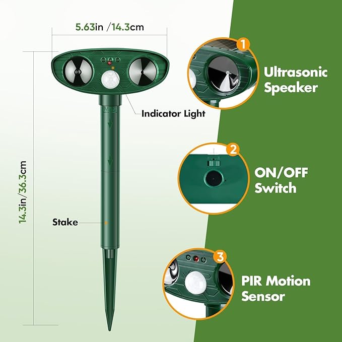 - 【Safe & Human Design】The squirrel repellent outdoor is only to drive the animal from garden. No hurts to human's health, the passive infrared sensor (PIR) detects motion and triggers and then the ultrasonic speaker make a noise to scare squirrel deer raccoon rabbit cat dog skunk fox away from farm yard garden.