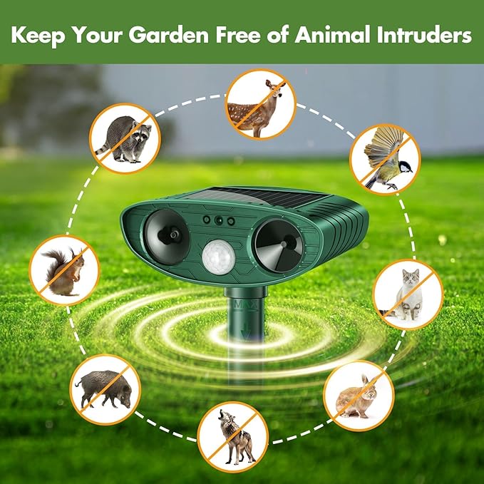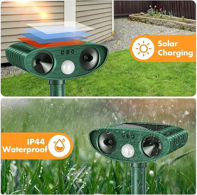 - 【Upgraded Solar Ultrasonic Animal Repellent】This Solar Animal Repeller has an advanced built-in PIR motion sensor, which detects movement within a 110 degree arc and detects motion up to 26 feet, emitting ultrasonic waves at frequency of 13.5-45kHz to scare the dogs, cats, wild boars, mouse, birds and more other animals away from your zone, house, garden, or yard more.