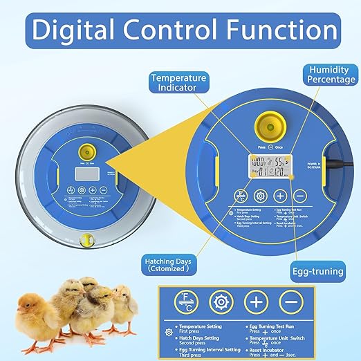- 【Constant Temperature & Humidity Control】The egg incubator is equipped with an advanced LCD digital temperature control system that can accurately adjust temperature and humidity. built-in fan system in the egg incubator assisted airflow circulation inside to keep the stable temperature for hatching eggs. Provide the best incubation environment for the eggs.