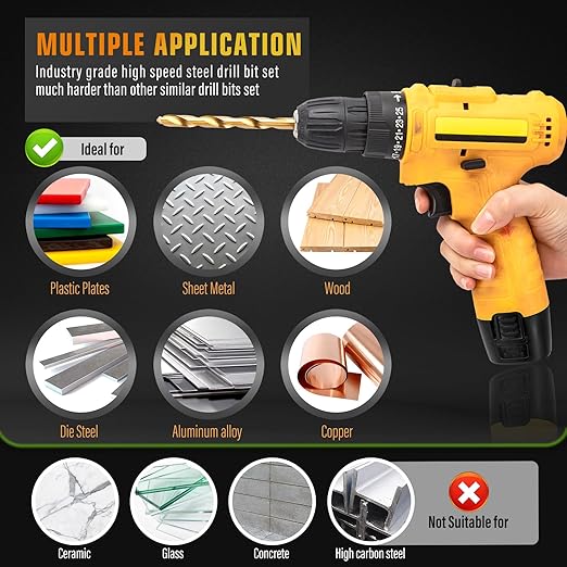 - HIGH SPEED STEEL MATERIAL - This titanium coated twist drill bit set are made of high-speed steel structure, titanium coating, and have strong durability. Hardened cutting edges and vibration free design ensure precise drilling and smooth hole walls