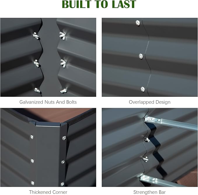 - Premium Powder-Coated Steel: Built with thickened galvanized steel and a dark gray powder coat. This metal raised garden bed resists rust, scratches, and harsh weather, ensuring your planter box stays durable and sleek for long-term use.