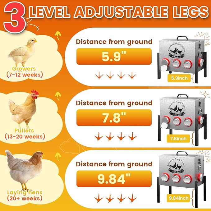 - 【Adjustable Legs for Universal Setup】Features three quick-adjust height settings on reinforced steel legs, securing stable positioning on grass, sand, gravel, or uneven terrain. Accommodates chickens, ducks, geesez poultry growth stages – from chicks to mature birds – eliminating the need for multiple feeders as your flock matures.