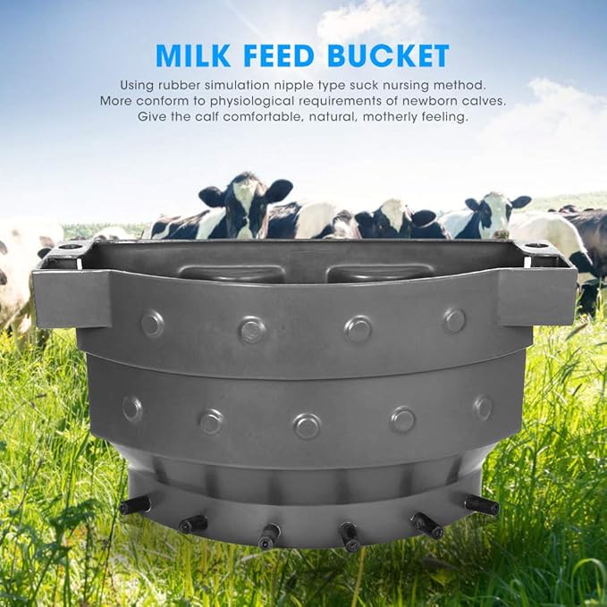 - [ NURSING EXPERIENCE] The calf milk feed bucket features rubber simulation nipples that mimic suckling, providing newborn calves with a comfortable and motherly feeding experience. This physiological design promotes development by meeting calves' nursing instincts while reducing stress during feeding time.