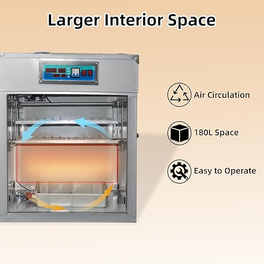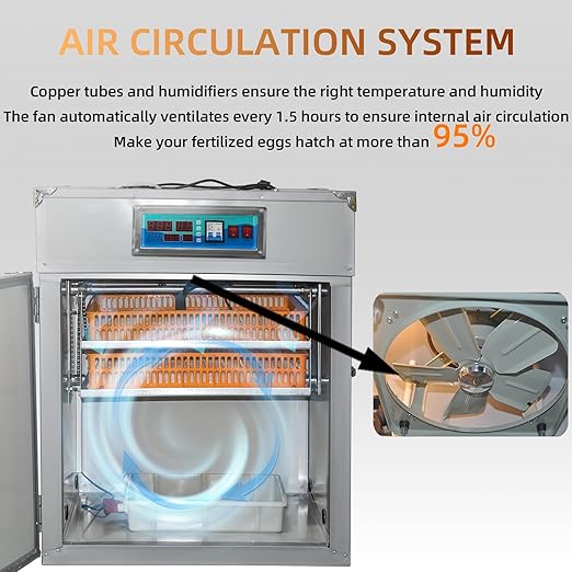 - 【Automatic Egg Turning】:According to your needs,provide a professional egg turning time to ensure that the yolk is fully rolled in the egg whites to improve nutrient utilization,and the way of turning left and right at 45°,which is more gentle to avoid embryo impact than the way of rolling eggs,increasing the hatchability rate to more than 95% and reducing the weak hatch rate to less than 1.5%
